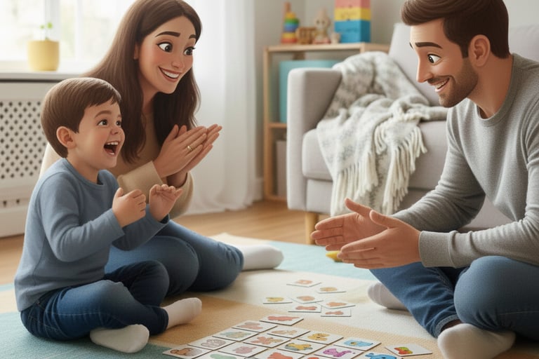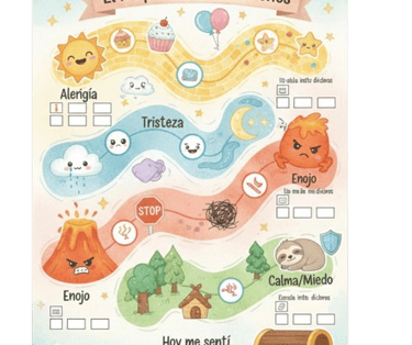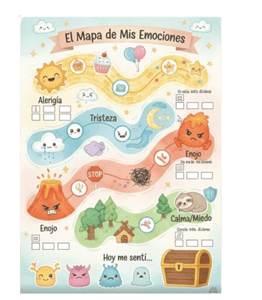 Ayuda al niño a ponerle nombre a lo que siente (alegría, tristeza, enojo, calma) mediante personajes lúdicos y colores.